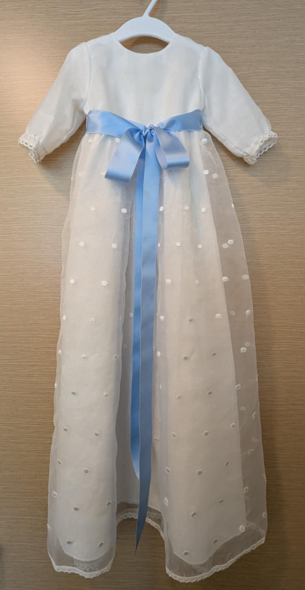 Dåpskjole 2-6 måneder. Har både rosa og blått bånd.