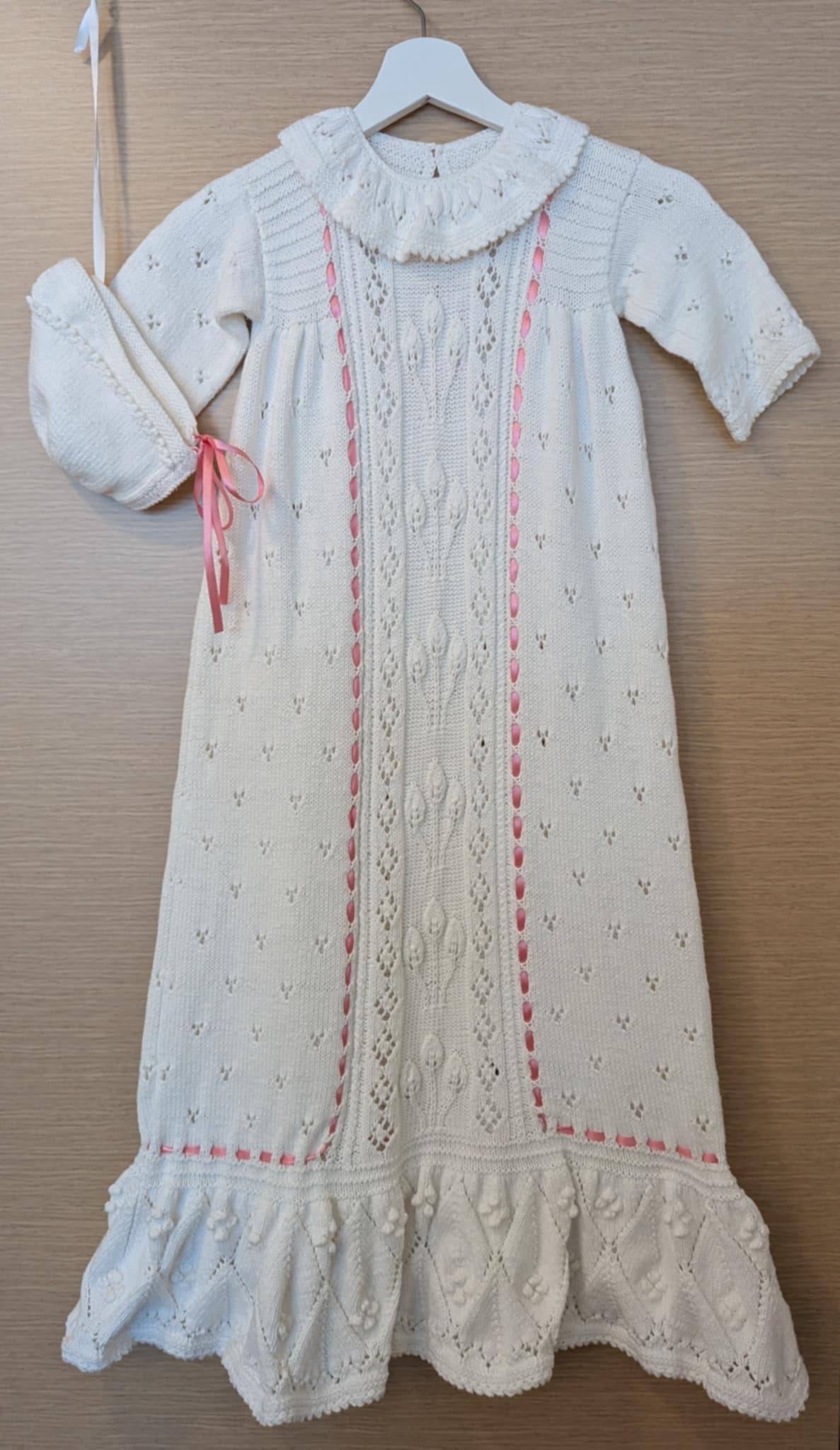 Hjemmestrikket med lue. Størrelse 3-8 måneder. Har både rosa og blått bånd.