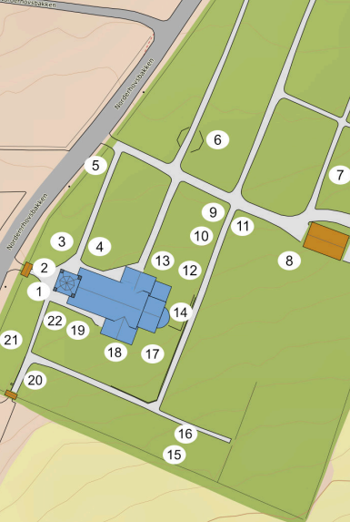 De ulike gravstedene er merket av på kartet. Du kan selvfølgelig gå når det passer for deg