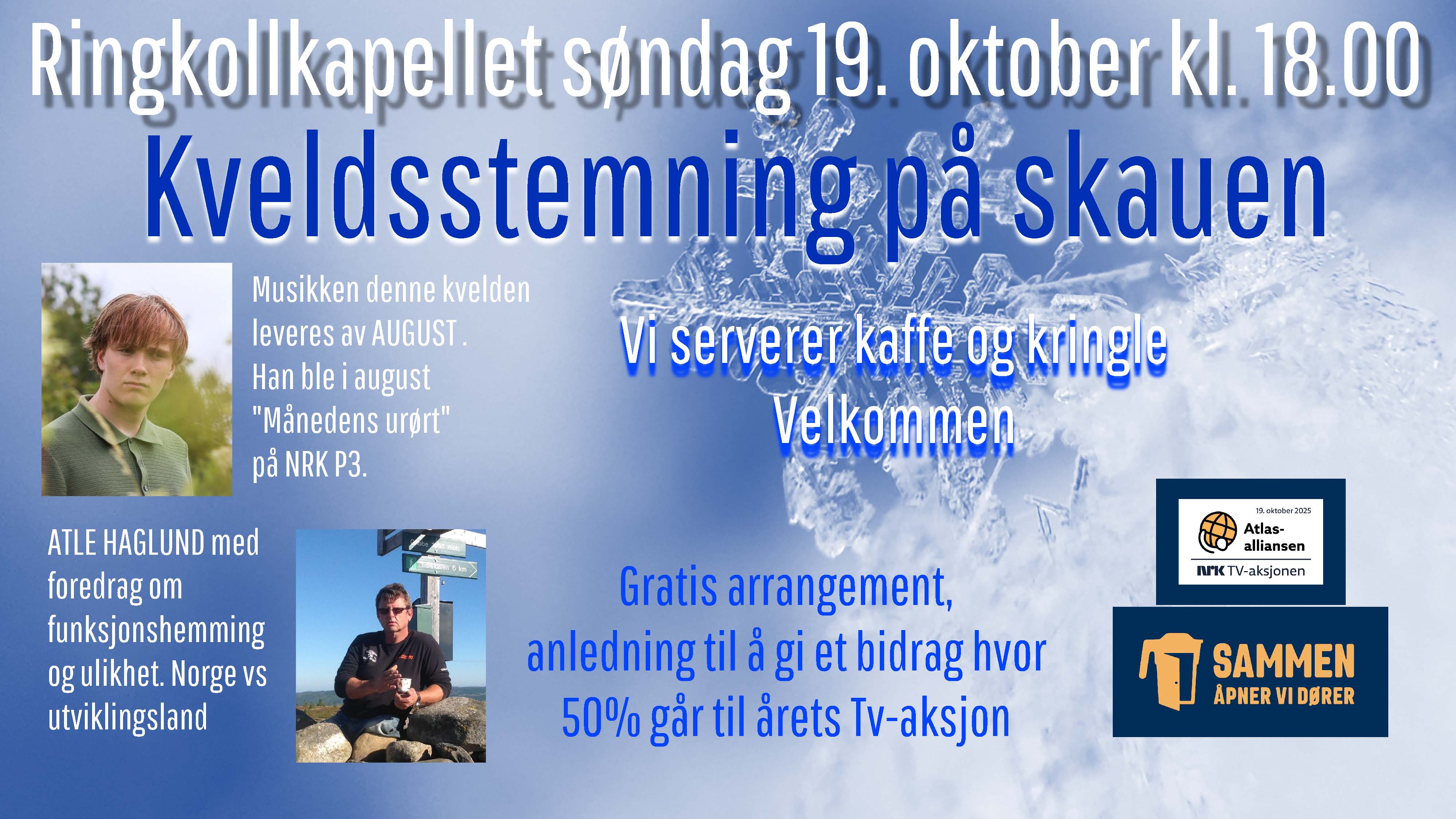 Velkommen til Kveldsstemning på skauen på Ringkollkapellet. Søndag 19. oktober kl. 18.00 inviterer vi til en stemningsfull og trivelig kveld, hvor det blir foredrag ved Atle Haglung og musikk ved August Saxegaard.