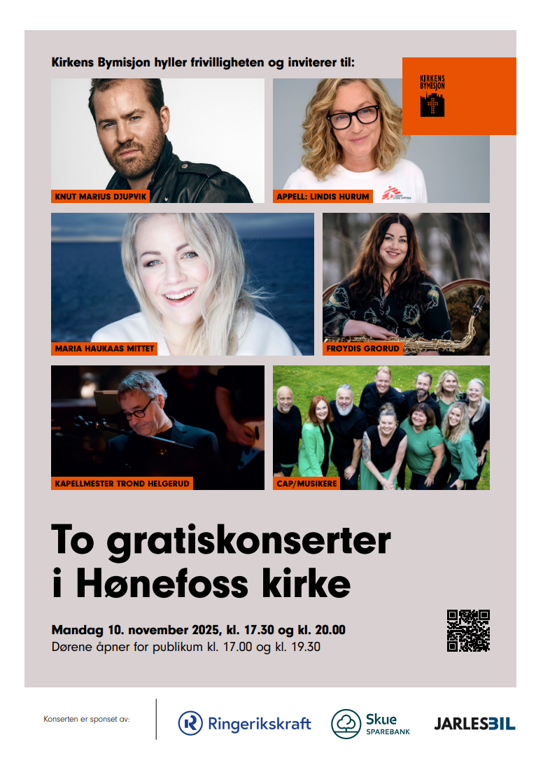 Kirkens bymisjon inviterer til konserter i Hønefoss kirke mandag 10. november.