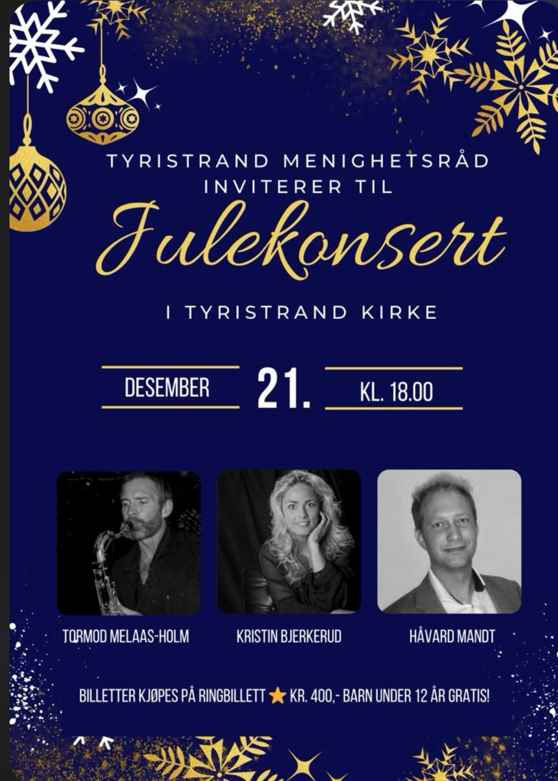 Konsert i Tyristrand kirke 21.desember kl 18.00.